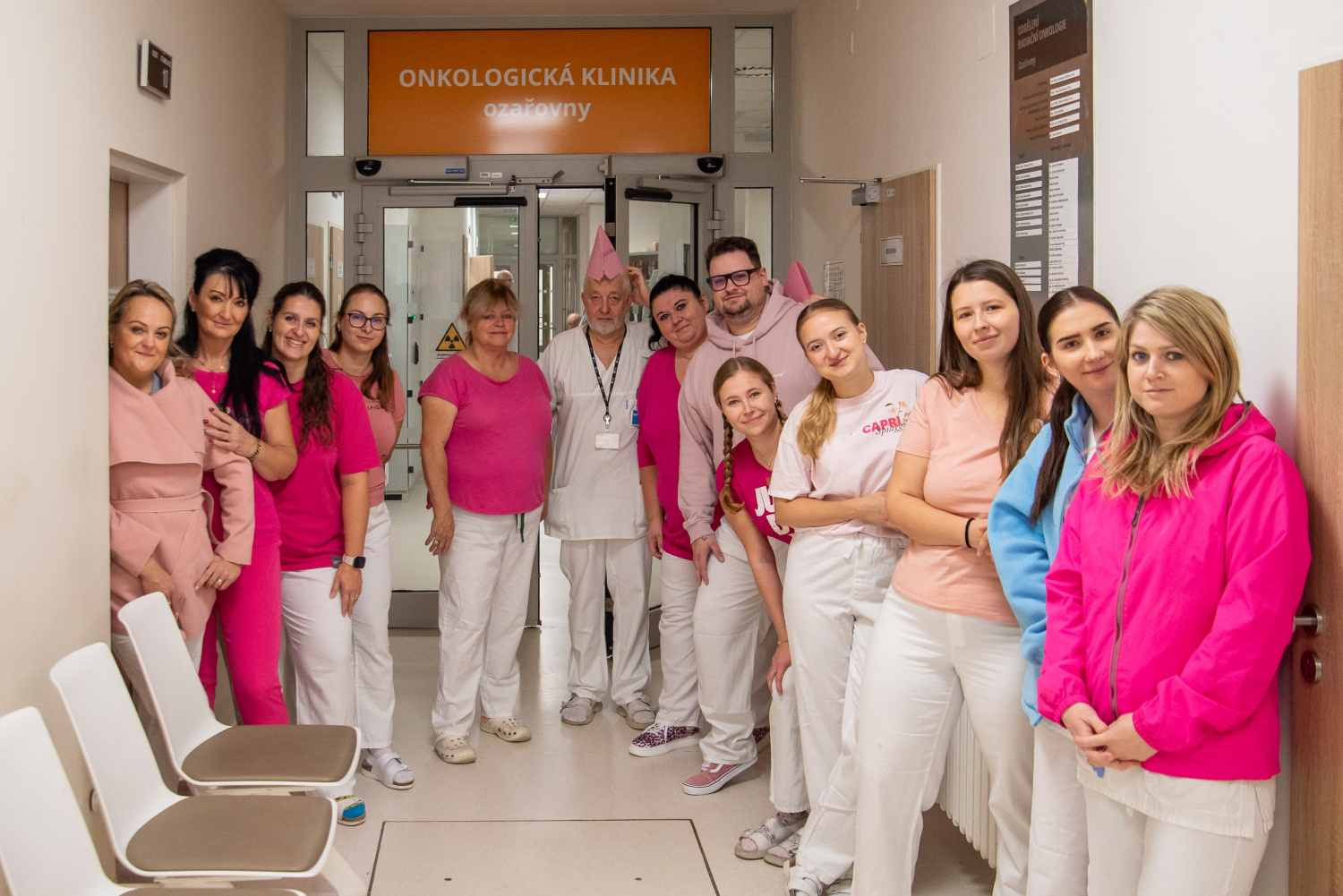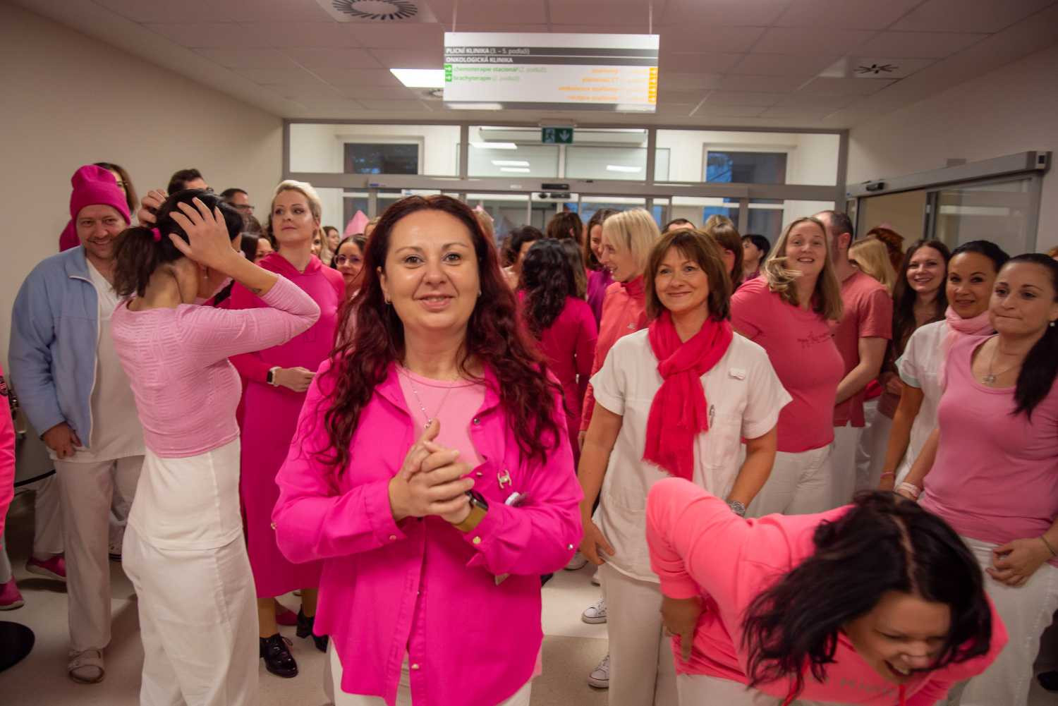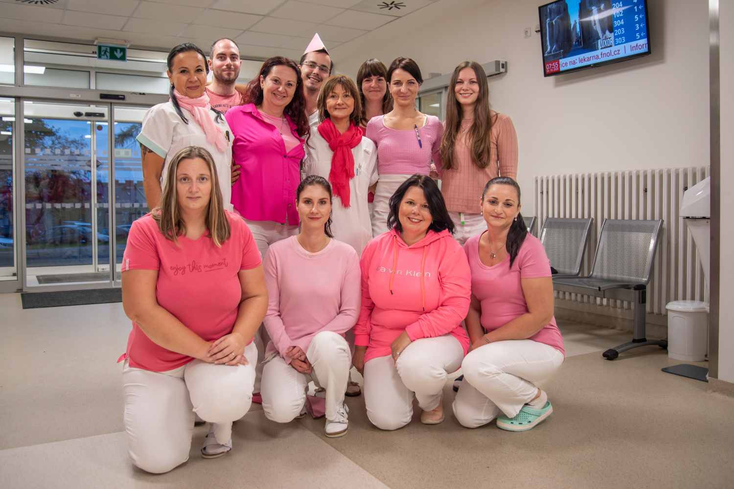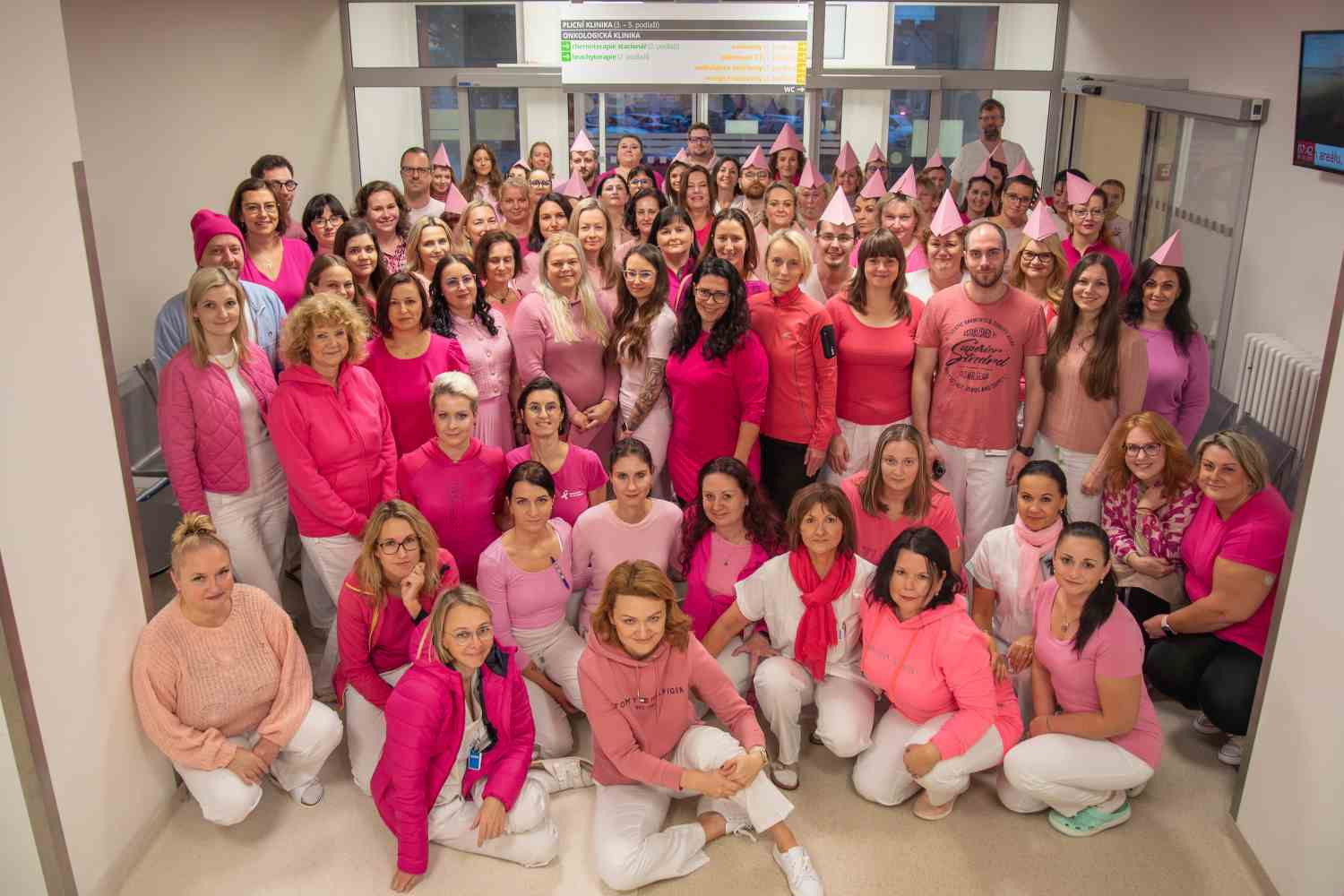 - Obrázek 1: Na čtvrtek 24. října připadá akce Pink@Work a do práce přišli v růžovém zdravotníci Onkologické kliniky, Oddělení mamární diagnostiky Radiologické kliniky, Kliniky nukleární medicíny, Chirurgické kliniky a Ústavu klinické a molekulární patologie.